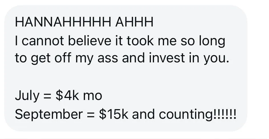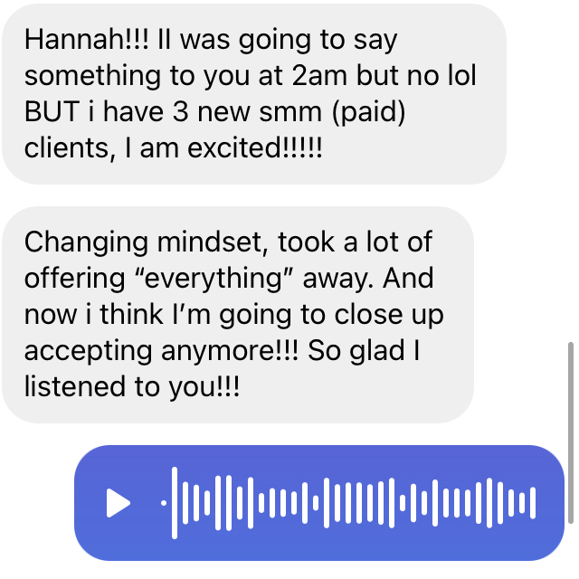 Everyone gets one 30 minute session within their first month of the program. There is also one group strategy call every other week where you can get on the hot seat, get feedback, and dive into YOUR content and messaging strategy. In addition to that, each week you'll see Hannah plug in to answer questions, give content feedback, and challenges inside the community channel.